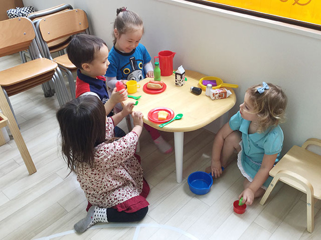 子ども同士の交流やグループでの遊びの経験を目的にした就園準備クラス。グループ活動の基礎を育むサークルタイム、個人の興味を重視したワークタイムなど、子どもたちの生活リズムを考慮したバランスのよいデイリープランで、自立心を育み、社会性を伸ばします。ミュージック&ムーブメント(音楽と運動)、アート(創作)、ストーリー(お話)、グループゲームなど、Native講師との楽しい遊びを通して、英語への好奇心と自信を育み、国際的な考え方も学びます。
